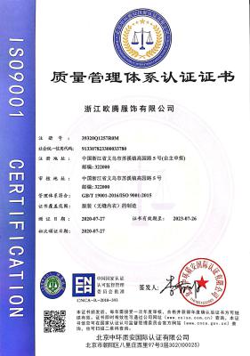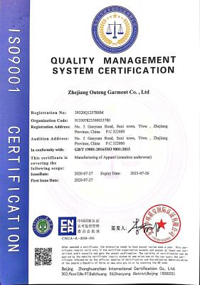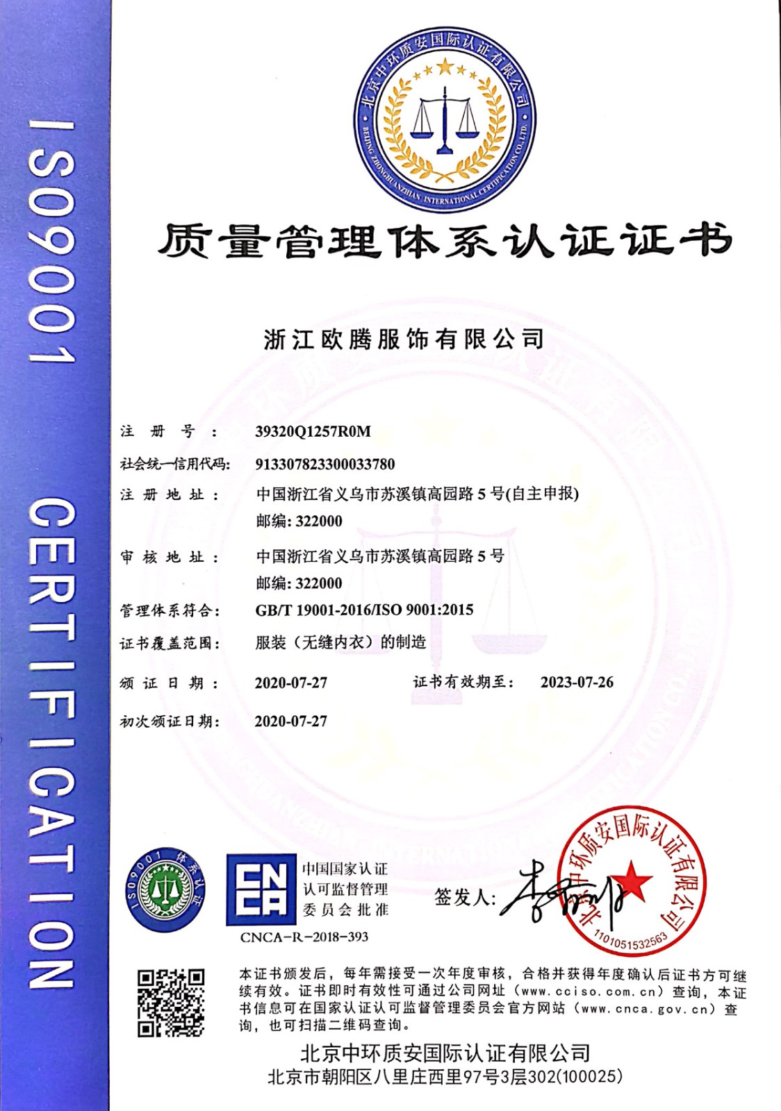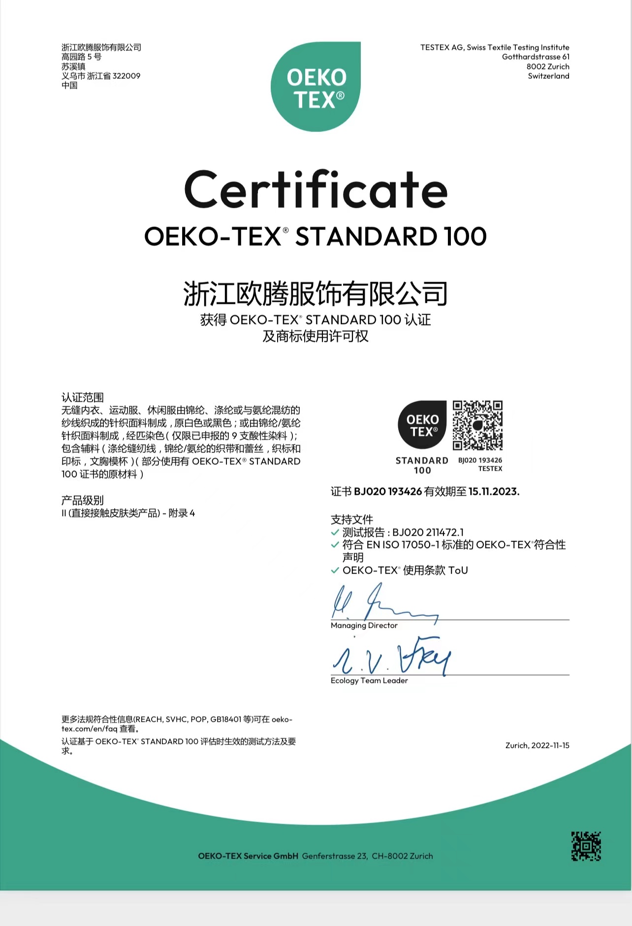浙江歐騰服飾有限公司位于世界小商品之都-義烏。創(chuàng)立于2015年,是一家專業(yè)生產(chǎn)無縫針織運動服飾和內(nèi)衣的工貿(mào)一體企業(yè),擁有自主出口權(quán)。 工廠的占地面積約16000平方米 ,引進了大型圣東尼、高騰等多種先進的制衣設(shè)備300余臺。月產(chǎn)能可達90萬件。 歐騰服飾每年投入近百萬資金打樣開發(fā)新產(chǎn)品,有著一支高素質(zhì)設(shè)計、技術(shù)員工隊伍。工廠先后通過了ISO 9001質(zhì)量管理體系認證、BSCI認證、GRS認證、OEKO-TEX國際生態(tài)紡織品認證等多項專利檢測報告??商峁㎡EM&ODM服務(wù)。歐騰服飾以一套完整、科學(xué)的質(zhì)量管理體系,生產(chǎn)的服裝從原材料紗線到成衣,質(zhì)量完全能夠滿足國內(nèi)、國際質(zhì)量要求。獲得了客戶一致好評。工廠先后獲得省科技型企業(yè)、國家高新企業(yè)、義烏市誠信講信用單位、規(guī)上企業(yè)、信用AAA級等榮譽。
